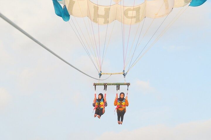 Hanging and floating in the air makes you flutter and are presented to views of Tanjung Benoa beach, Nusa Dua and views of the bridge over the sea.